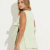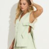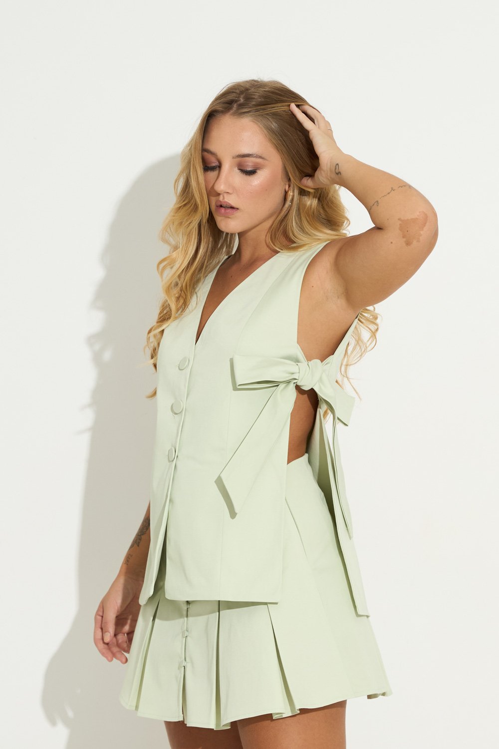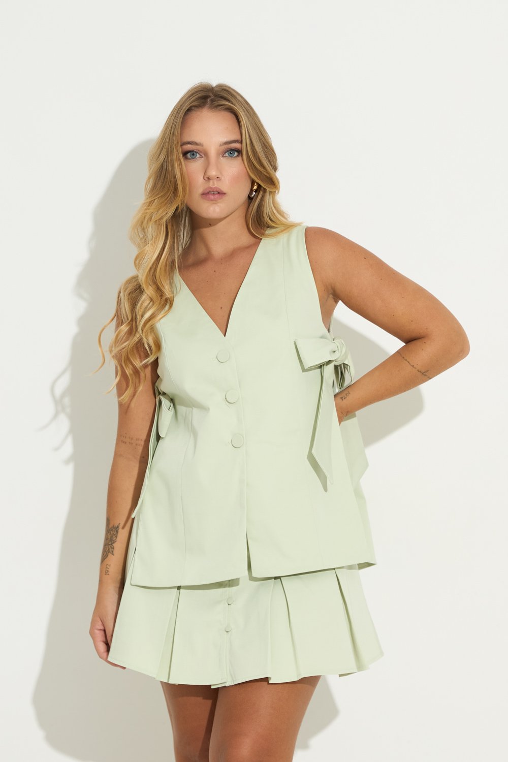 Colete corte alfaiataria sem manga, com recortes frontais e laterais seu fechamento é pelas faixas nas laterais