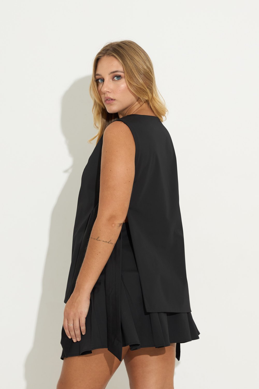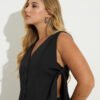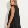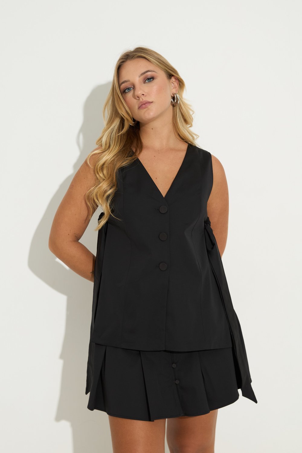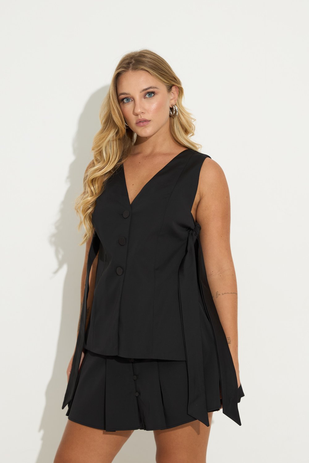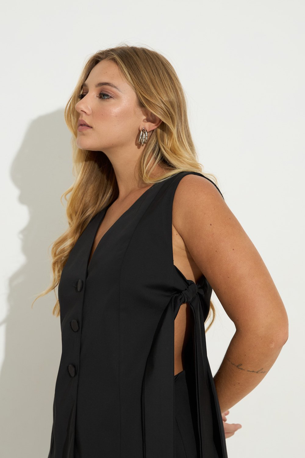 Colete com recorte em alfaiataria, seu fechamento é feito pelas faixas laterais e pelos botoes frontais.
