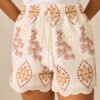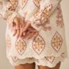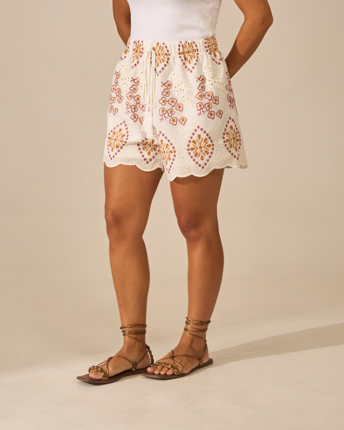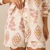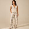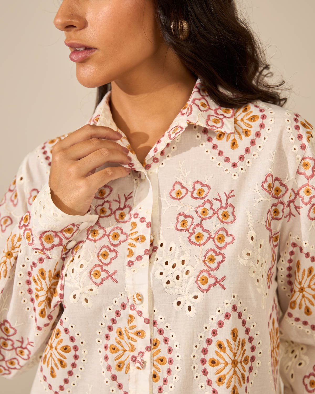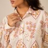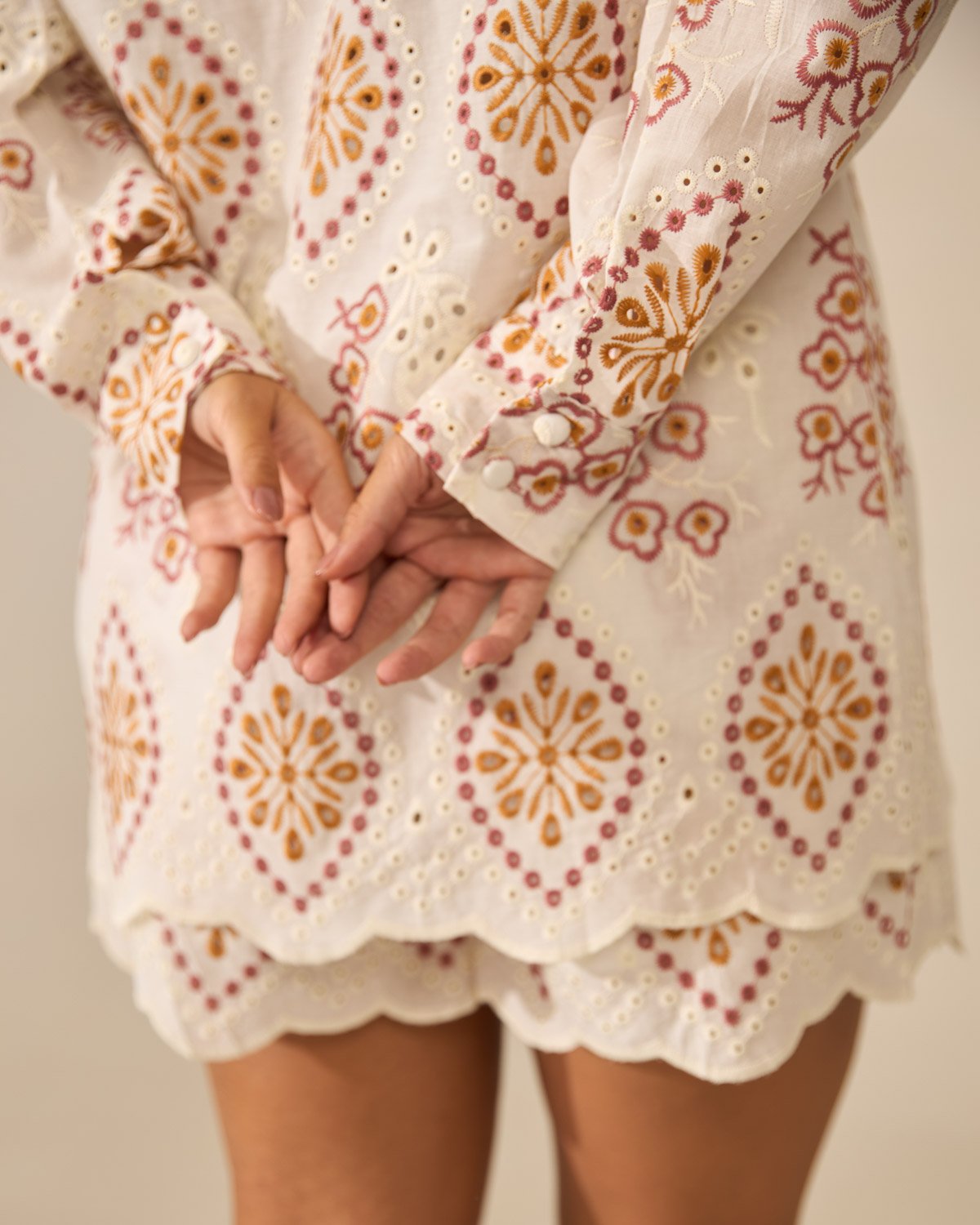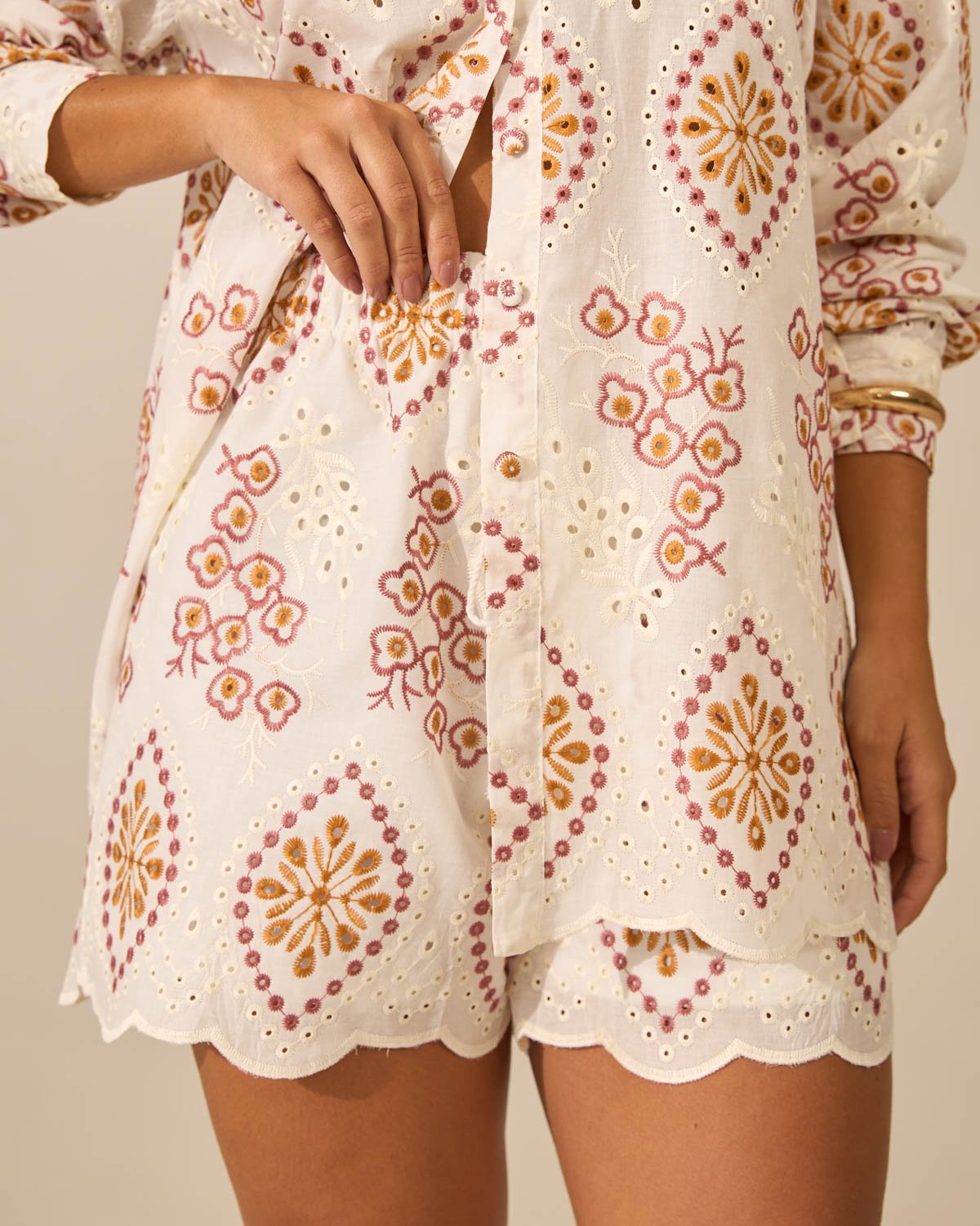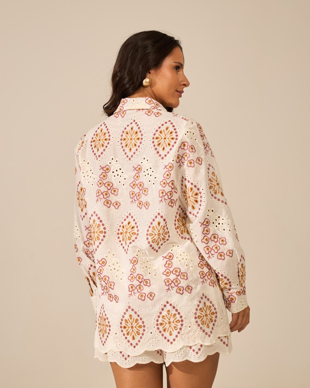Conjunto é composto por camisa em laise com modelagem oversized, fechamento frontal por botões e